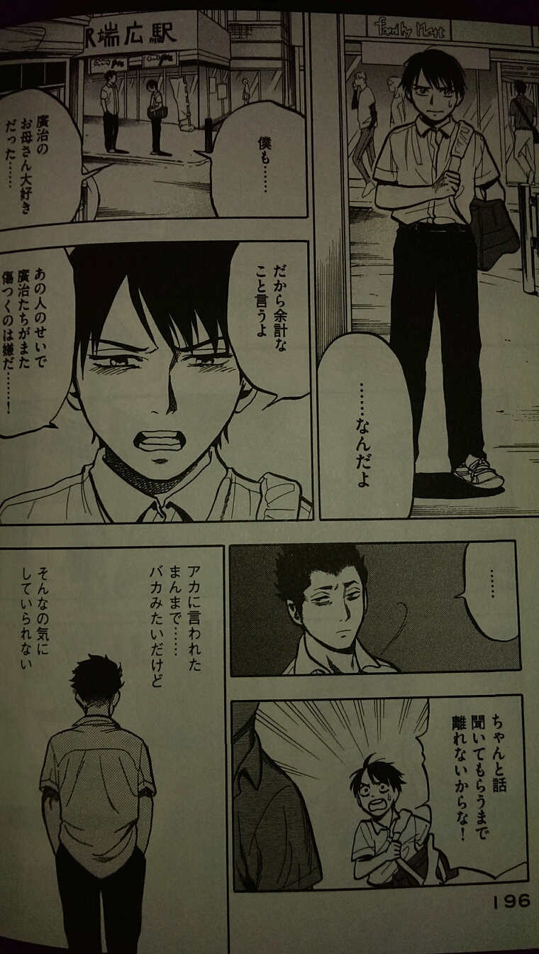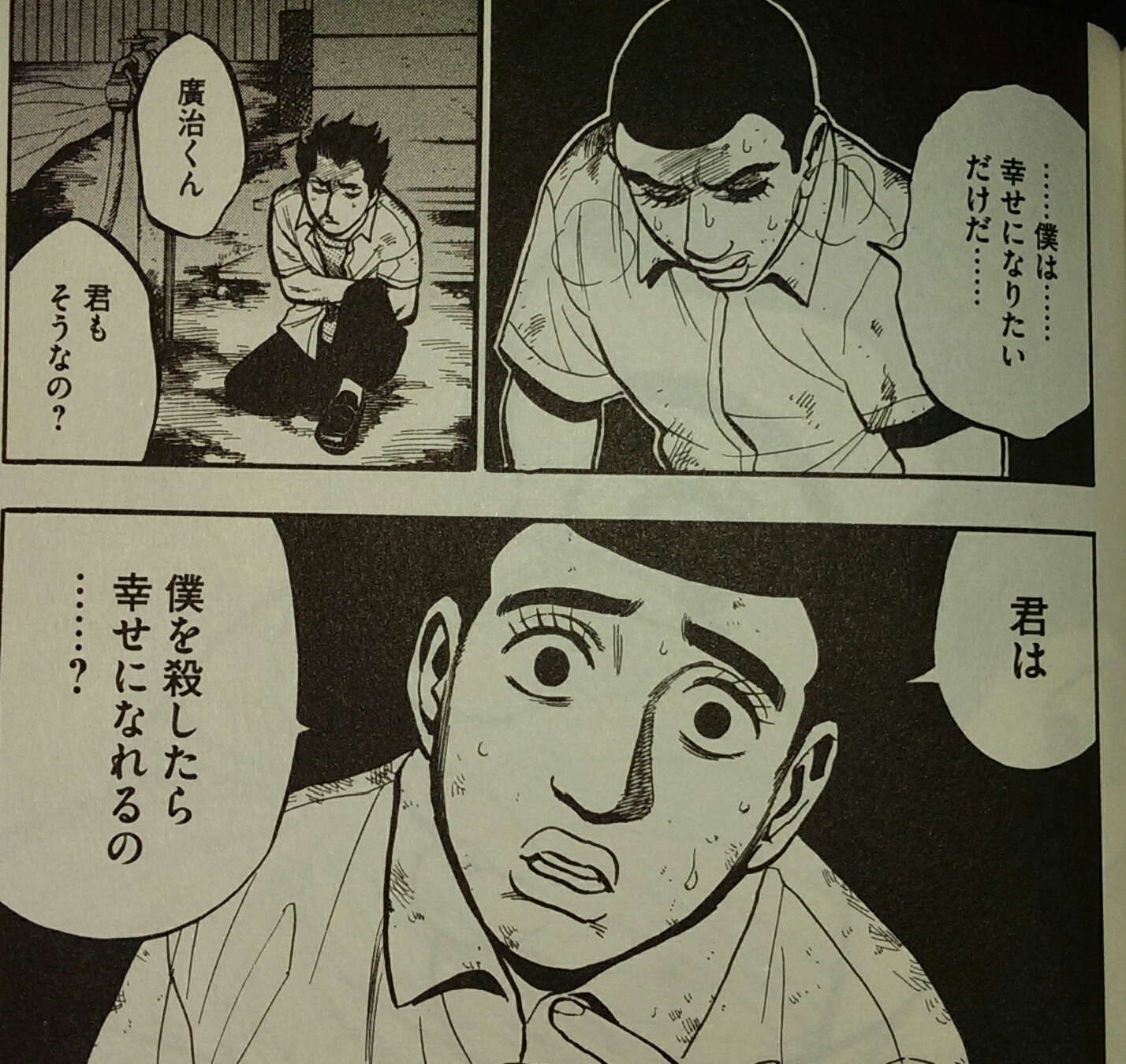 廣治の母を殺した犯人は極めて自分本位で罪の意識が低く、廣治の復讐心・殺意を煽ります。アオは何とか正論を語って廣治を止めようとするんですが、こんな人間を前にして殺意を止めることなんてできるわけがなく、廣治は彼を殺害する一歩手前まで行ってしまいます。しかし良心や母のことを思ってとどめがさせない。
