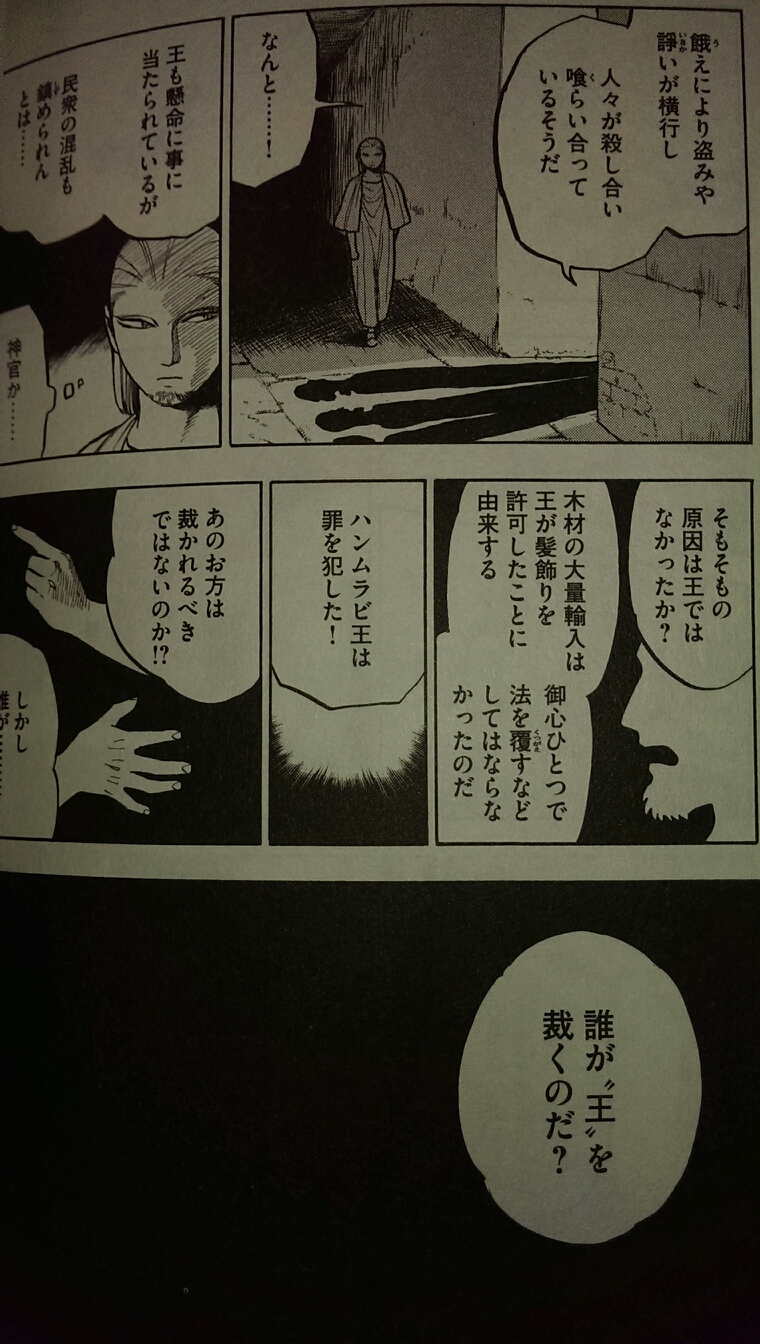 ハンムラビ法典を編纂したハンムラビ国王が現世にタイムスリップし、現代法と刑罰の曖昧さ、日本人が死刑を忌避していることに対して疑問を抱き、絶対強固な法によって支配された世界を作ろうとする、って話です。
