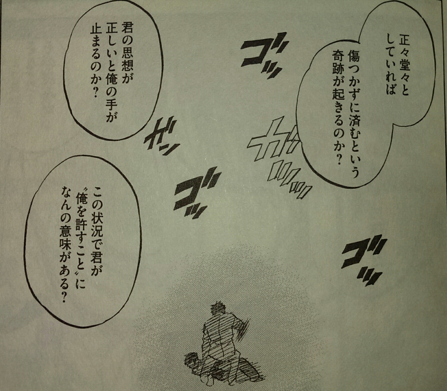 漫画を読んでる時に、理由もなく正義活動に身を削っている主人公をみると違和感があったりします。困ってる人がいたら助ける、世界を滅ぼそうとするやつがいれば、みんなのためにそいつを倒す、物語のヒーローとしてはすごく当然のことで、その是非を疑う余地はない。それはそうなんですが、なんかピンと来ないんですよね。