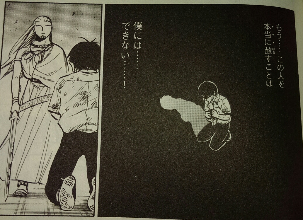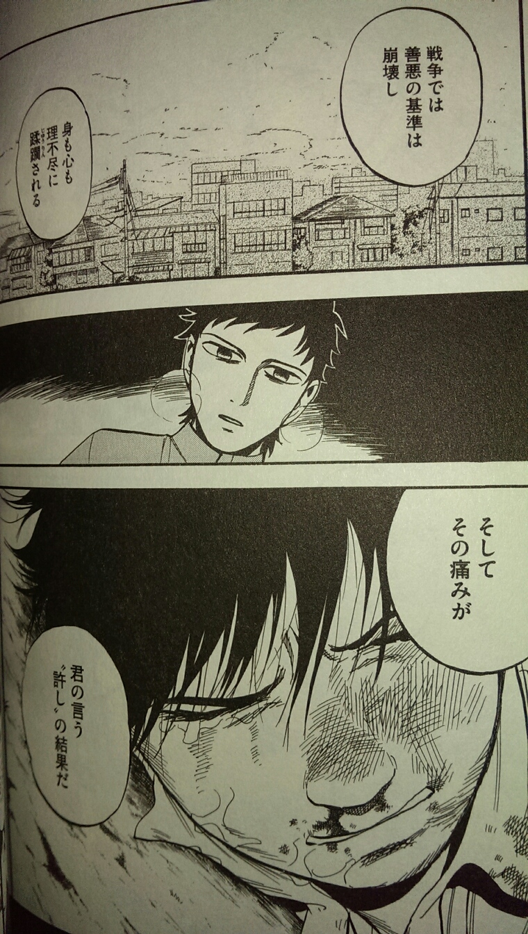 目の前で親友を殺されたアオくんは、一瞬我を忘れてアカに刃を向けてしまいます。他人を赦す法を謳う彼は、自分の中の心の矛盾に苦しみます。