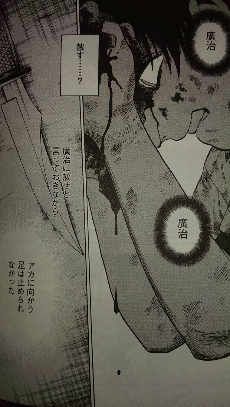 そこで突然現れたアカが、廣治に代わって犯人を処刑します。廣治の殺意はアカによって救われ、闘争から解放されます。自分の言葉では廣治を救えなかったこと、アカの法と厳罰の執行に、自分の考えでは対抗できないということを、アオは実感します。