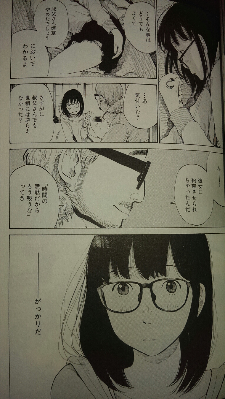 『としのせ』では世相に上手く従って生きる大人への反発が、ヒロインの反社会的なものへの憧れを誘発し、その象徴として煙草が充てられていました。叔父は大人のなかでも退屈でない、最後の希望だったのかもしれません。大人は世相に従う、退屈な存在です。
