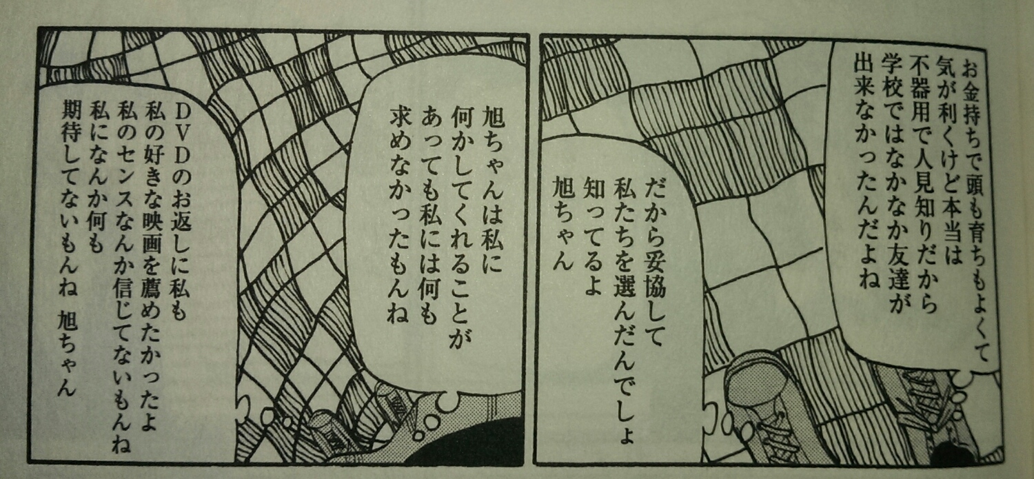 阿部共実漫画のキャラクターは何か失敗をした時にとても自己肯定的な言い訳を言って自分を守ろうとしたり、他者を貶めるような発言をして相対的に自分の至らなさを目立たなくするような、しんどい生き方をしていてとても痛ましい。