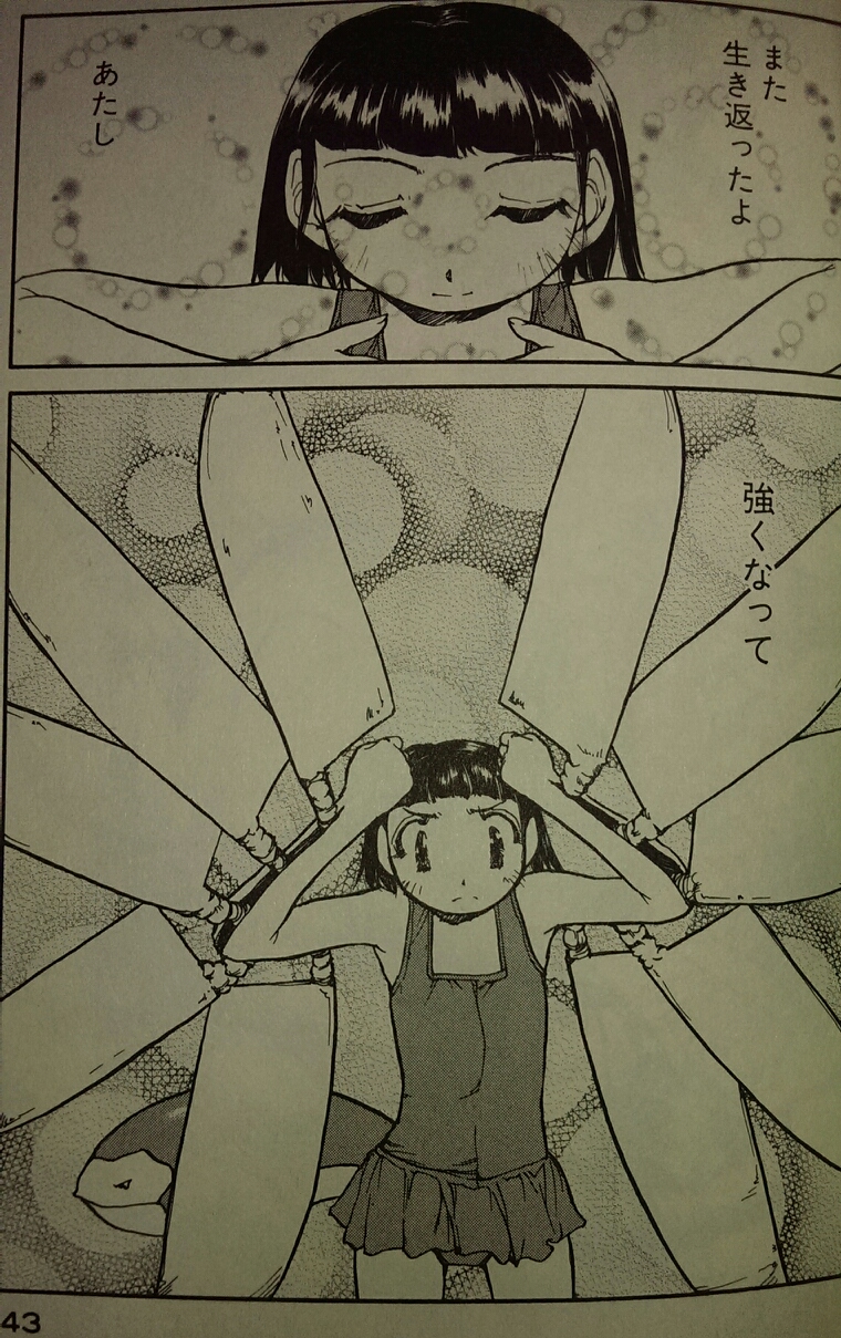 富沢先生の漫画、難解な時間概念やら宇宙再構築計画とか多用する割に説明がすごく感覚的な言葉で済まされていて、理論立てた謎解明がなく、読者の自主的な理解努力にかなりの部分が委ねられているんす。物語のエンディングにつながる重要なシナリオ、「ミルククローゼット」における大人宇宙形成計画、「エイリアン9」における寄生生物の特性、「ゆめにっき」に秘められた謎、これらは全て回りくどい言い回しで二言三言触れられるだけで、それらがどんな概念であるかは行間から全力で拾い集めても分かるかわからないかのギリギリのところにあって、頭にスパッと入ってこないんす。