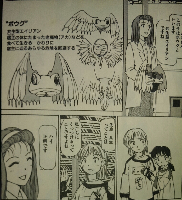 物語終盤になると来襲するエイリアンは人間をホストとして寄生発展を目論む「ドリル族」による差し金であることがわかり、エイリアンとの戦いの中で成長した児童を(ドリル族)寄生生物「ボウグ」と共生同期させることで安定した寄生を実現するための計画に、主人公たちが利用されていたことがわかるなど。アニメ(OVA?)化もされている、富沢先生の代表作ですね。