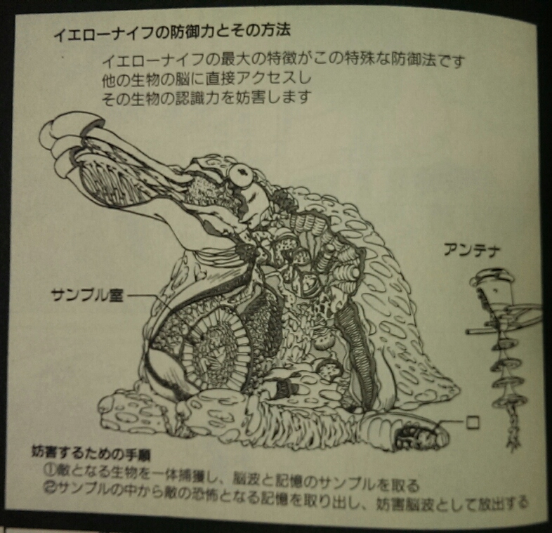 イエローナイフというエイリアンは基本的に無害なんですが外敵から身を守るために、その地域に住む生命体を体内に取り込んで、その生命体にとって最も効果的と思われる妨害電波を作り出し身を守るという、ウルトラ怪獣のような生き物です。作中では人間を取り込み、周囲の人間の視界に人間が映らなくなる妨害電波「ひとりぼっち」を放出し、主人公たちを精神的に追い詰めていました。しかしその電波も破られ主人公たちからガスガス攻撃され、涙を流しながら絶命していくという、本当にウルトラ怪獣的な哀愁を持つエイリアンです。ペンギンっぽい見た目もよいですね。