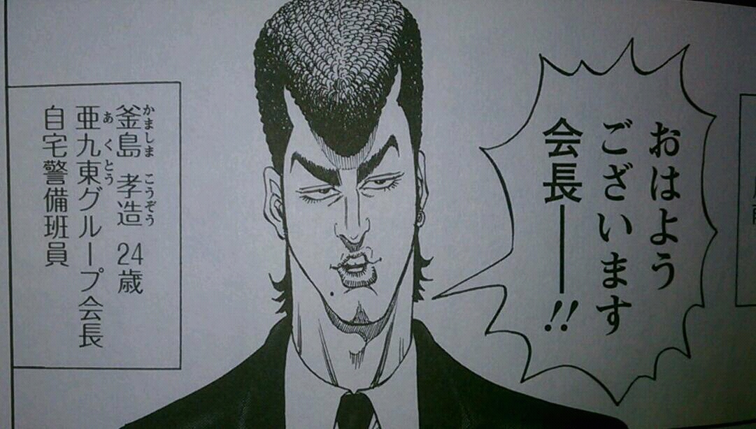 巨大闇組織・亜九東グループの構成員で、グループ会長亜九東正義(あくとう まさよし)の自宅警備を任されている男前チンピラ釜島孝造(以下コーゾー)