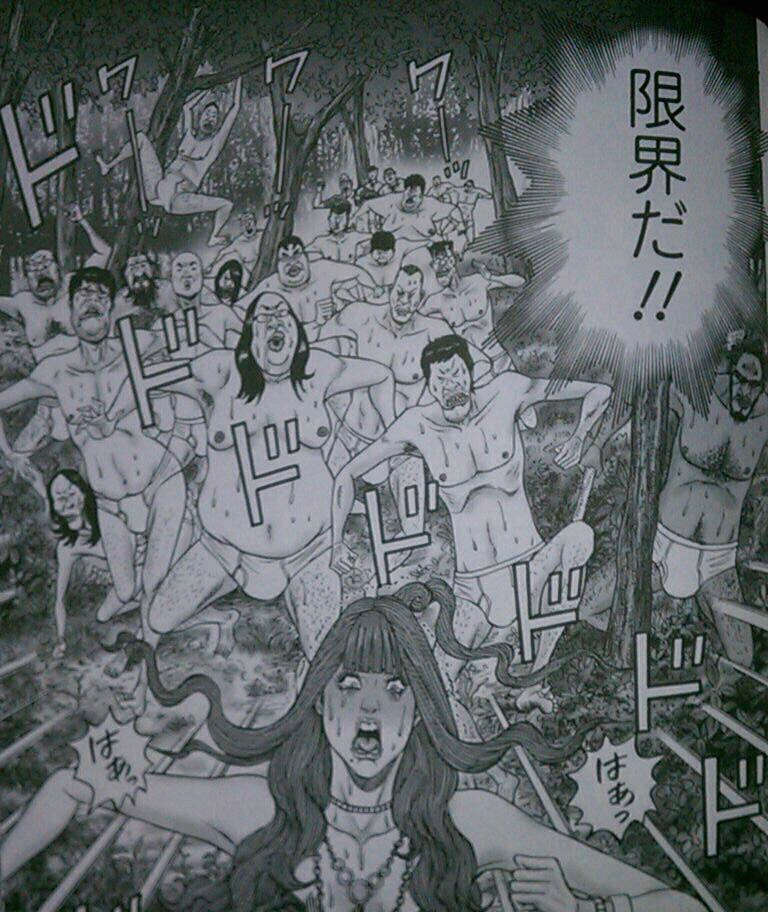 その地獄絵図、まさに『絶望の犯島~100人のブリーフ男vs1人の改造ギャル~』。しゃあなしにカマ掘ってたおっさんもギャル登場にこの咆哮