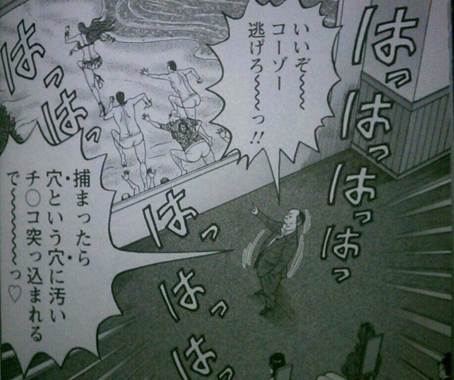 あの手この手で迫ってくる性犯罪者達にぶちこまれ寸前ギリギリのところで逃げ、囲まれては逃げ、精神的にも肉体的にも追い込まれるコーゾー。会長はその姿をモニターで見て大爆笑しています。